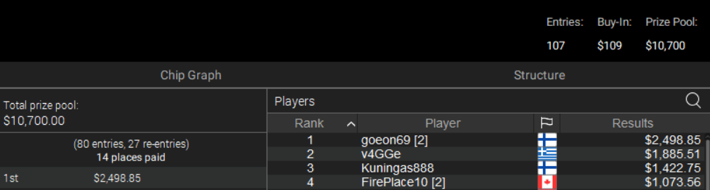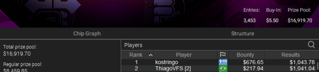 Δύο αξιοσημείωτα σκορ για τον “kostringo” που βρέθηκε στην κορυφή του $5.5 Micro Bounty Builder για $1.720 και στην 2η θέση του $11 Mini Fenomeno για ακόμη $1.562.