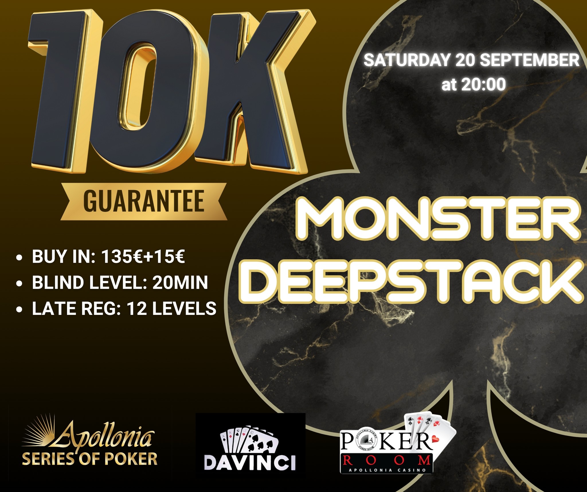 Το διήμερο Μοnster Deepstack στις 20:00 με €135 + €15 buy-in, 20λεπτα levels, 60.000 μάρκες αρχικό stack και €10.000gtd.