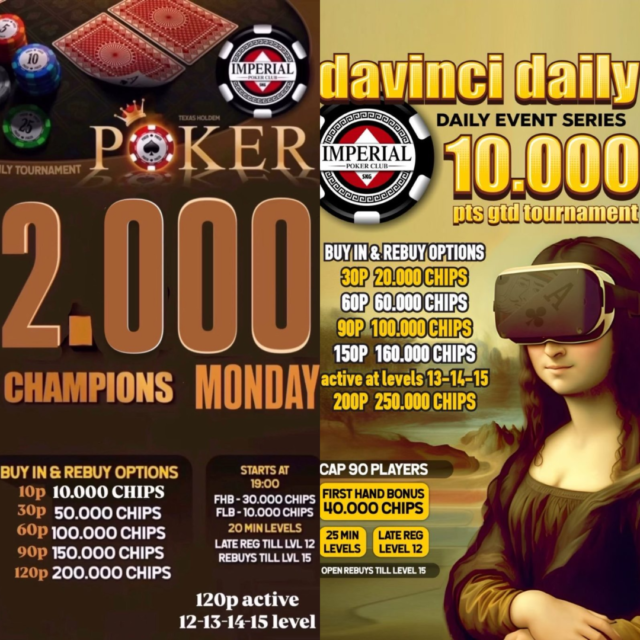 Σήμερα το Champions Monday με 2.000p gtd (ξεκινώντας ακόμη και με 10p) και αύριο το Davinci Daily με 10.000p (ξεκινώντας ακόμη και με 30p)!