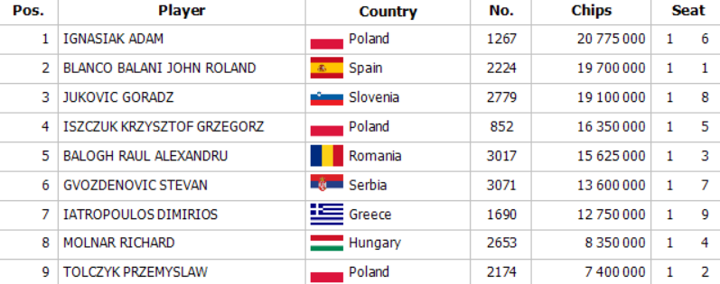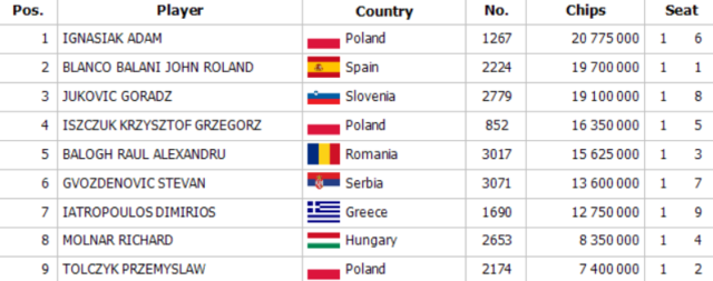 Ο Έλληνας παίκτης προκρίθηκε στο 9-handed final table με 12.750.000 chips, το τρίτο μικρότερο stack του τραπεζιού.