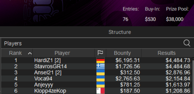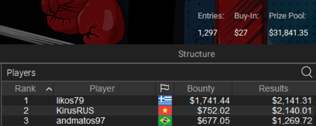 Στο heads-up του $530 Bounty Builder ηττήθηκε εξάλλου ο “StavrosGR14” κερδίζοντας $6.212.