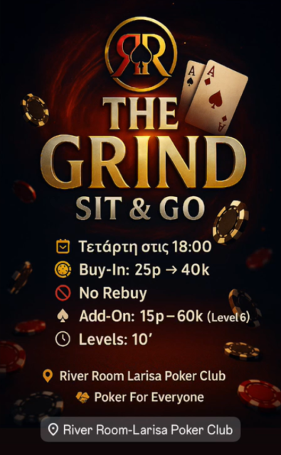 To River room της Λάρισας συνεχίζει ακατάπαυστα, με το πρόγραμμα της Τετάρτης να περιλαμβάνει The Grind sit & go και ring games στη δημοφιλέστερη παραλλαγή!