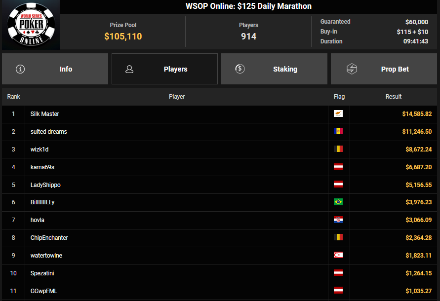 Πρωτιά και για τον Νίκο “Silk Master” Αγγέλου που κατέκτησε την κορυφή του $125 Daily Marathon για $14.586, ενώ την ίδια μέρα τερμάτισε στην 5η θέση του $200 Daily Special για ακόμη $3.916!