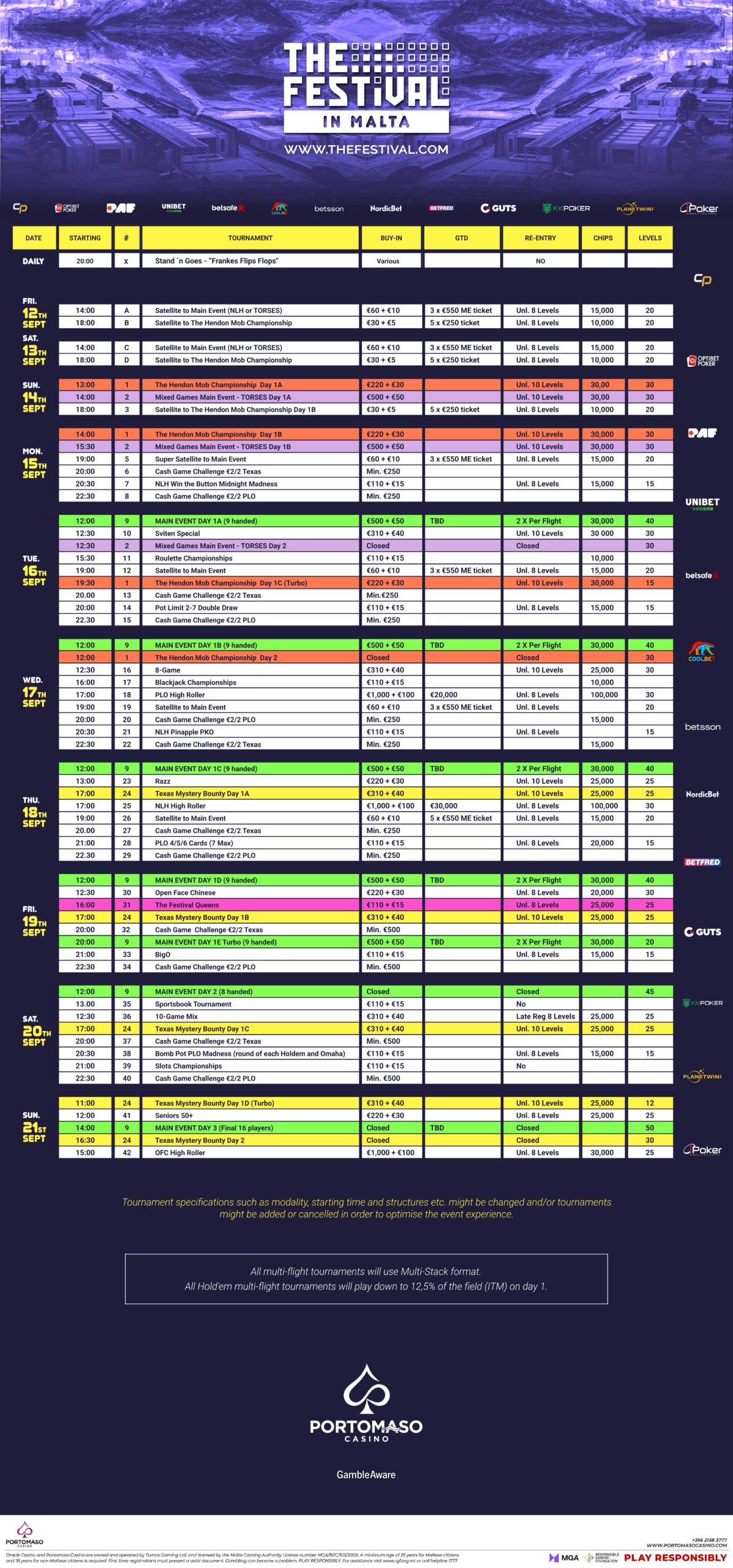 Η The Festival Series ήταν πάντα κάτι παραπάνω από απλό πόκερ. Από events σε blackjack και ρουλέτα μέχρι οργανωμένες δραστηριότητες μακριά από τα τραπέζια, η στάση στη Μάλτα θα φέρει ξανά όλα όσα κάνουν το Festival μοναδικό. Πρόκειται για πραγματικές διακοπές πόκερ, με επικά side activities, πληθώρα τουρνουά και cash games, με κάτι για κάθε τύπο παίκτη.