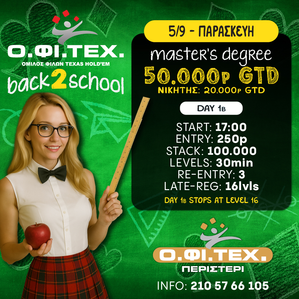τo freeroll mystery bounty και τη Day 1b του Master’s Degree (50.000p gtd) στο Περιστέρι