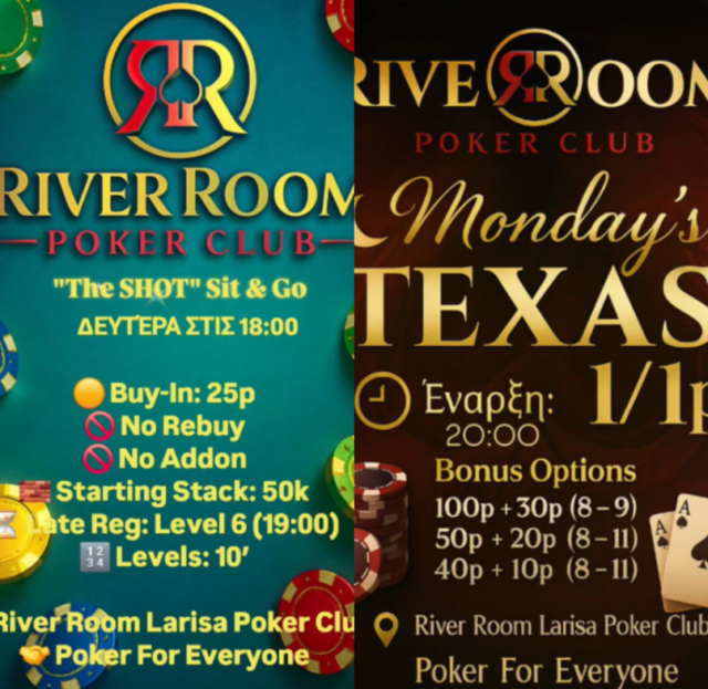 Ο σύλλογος ‘River room poker club’ εδρεύει στην οδό Γρηγοροπούλου 1, δίπλα στα Υπεραστικά Kεντρικά ΚΤΕΛ της Λάρισας.