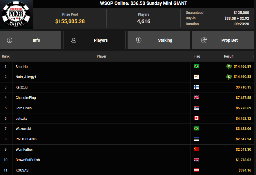 Στο heads-up του $36.50 Μini Giant έφτασε ο “Nuts_Allergy1” κερδίζοντας $14.461!