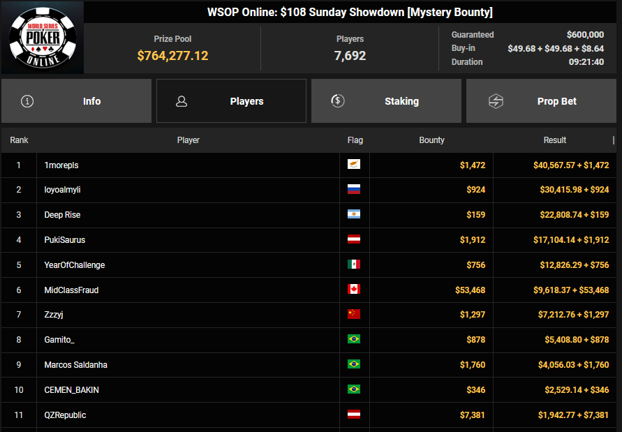 To cash της ημέρας πάντως ήρθε από τον “1morepls” που “σήκωσε” το $108 Sunday Showdown για $42.040!