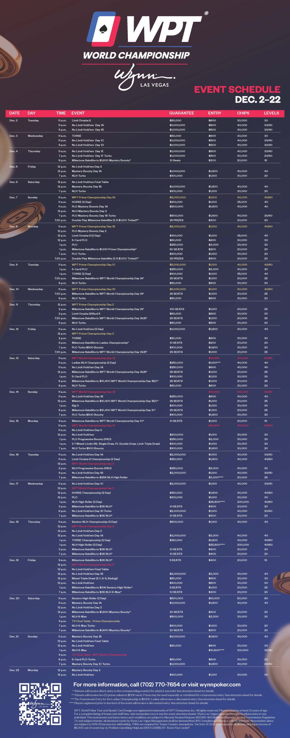Η σειρά θα βασιστεί και πάλι σε δύο μεγάλα τουρνουά: το WPT World Championship με buy-in $10.400 (13-21 Δεκεμβρίου) και το WPT Prime Championship με buy-in $1.100 (7-12 Δεκεμβρίου). Για δεύτερη συνεχόμενη χρονιά, το κεντρικό event του φεστιβάλ δεν θα έχει guarantee, καθώς πέρυσι έφτασε οριακά στον φιλόδοξο στόχο των $40 εκατομμυρίων. Αντίθετα, το WPT Prime Championship θα διαθέτει εγγυημένο prize pool $5 εκατομμυρίων.
