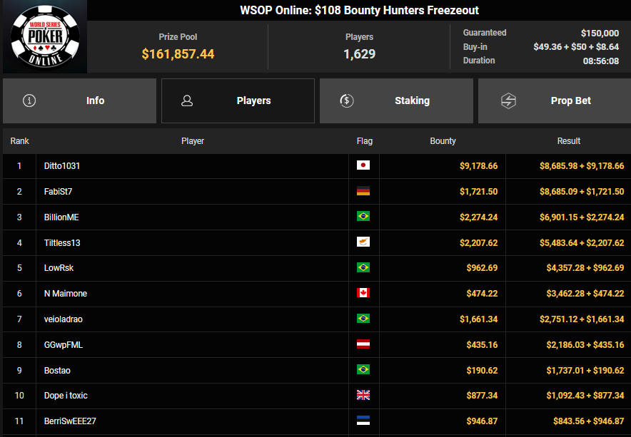 Στην 4η θέση του $109 Bounty Hunters τερμάτισε εξάλλου ο “Tiltless13” για $7.692.