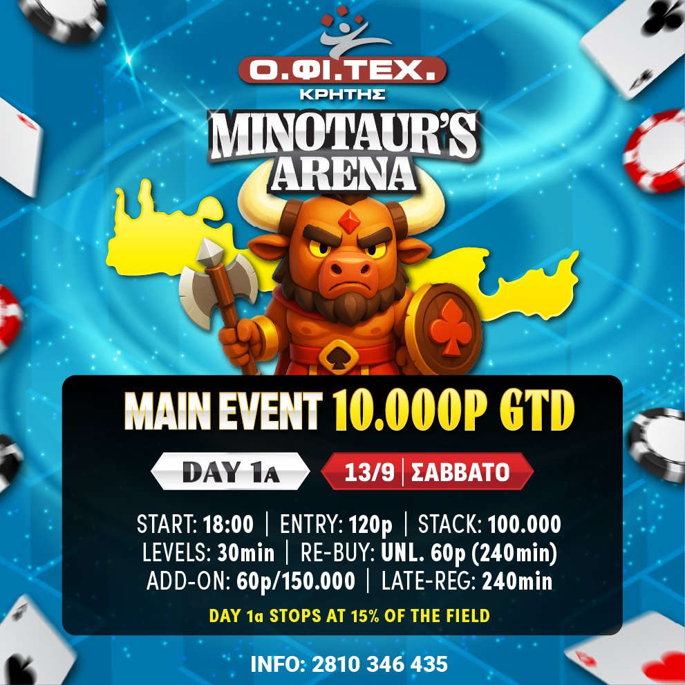 και τη Day 1a του Minotaur’s Arena main event (10.000p gtd) στο Ηράκλειο Κρήτης