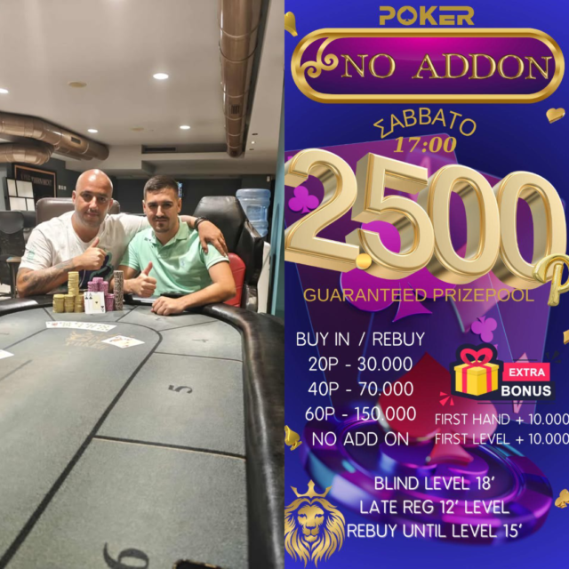 Λίγο νωρίτερα όπως κάθε Σάββατο (17:00) η έναρξη του No Addon που συνοδεύεται και πάλι από 2.500p gtd! Για τους φίλους των ring games φυσικά δεν θα λείπουν και τα Texas/PLO games τις βραδινές ώρες.