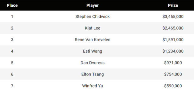 Με αυτή τη νίκη, ο Chidwick περνάει το όριο των $70 εκατομμυρίων σε κέρδη καριέρας από τουρνουά ($71.729.542), και πλέον απέχει μόλις $6.690.286 από τον Bryn Kenney.