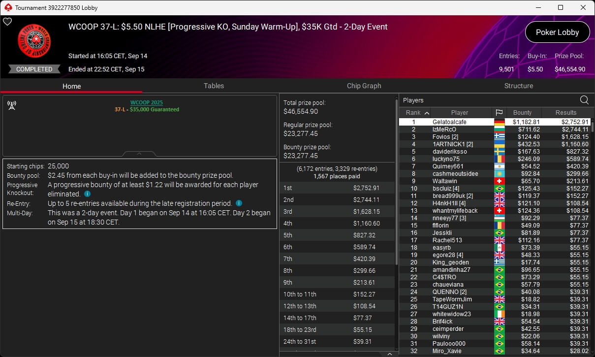 Στην 3η θέση του WCOOP 37-L ($5.5 NLHE PKO) αποκλείστηκε ο “Fovios” για $1.753.