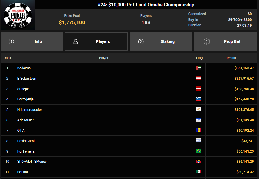 Ο Έλληνας παίκτης μπήκε στους επτά φιναλίστ της final day του $10k PLO Championship με το τέταρτο κορυφαίο stack και λίγο πριν τα μεσάνυχτα γνώρισε τον αποκλεισμό στην 5η θέση για $109.376!
