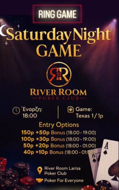 Ο σύλλογος ‘River room poker club’ εδρεύει στην οδό Γρηγοροπούλου 1, δίπλα στα Υπεραστικά Kεντρικά ΚΤΕΛ της Λάρισας.