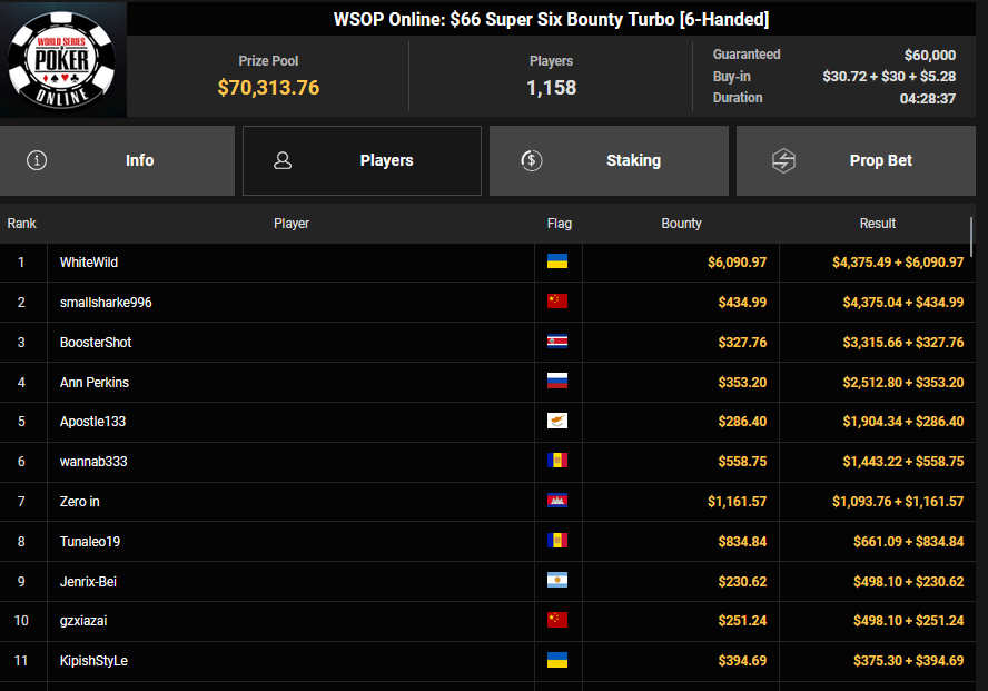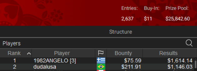Στην 5η θέση του $66 Super Six Bounty αποχώρησε εξάλλου ο “Apostle133” για $2.190.