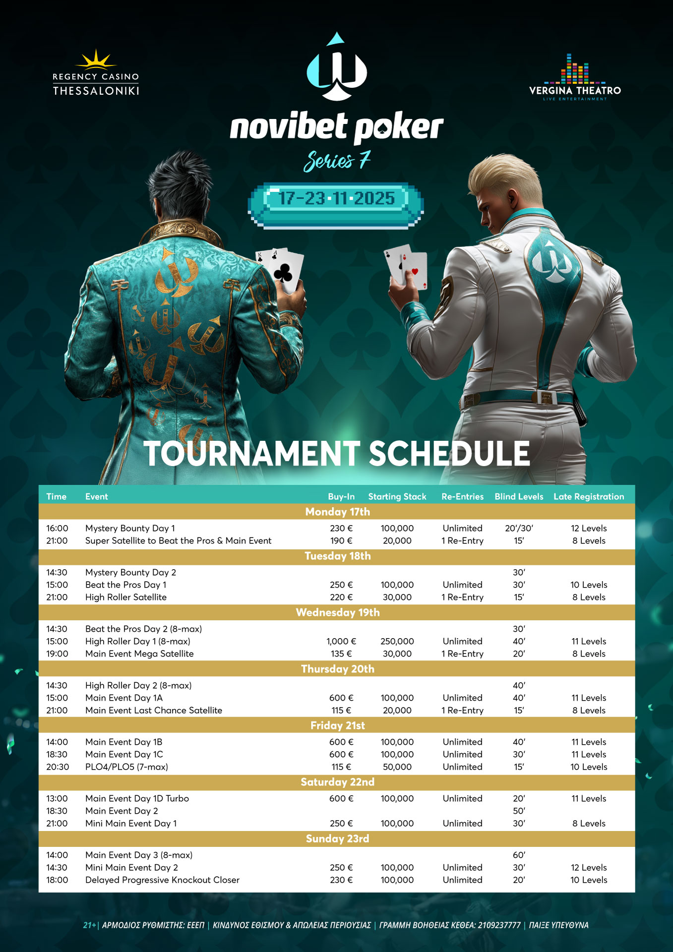 Οι ημερομηνίες οριστικοποιήθηκαν και η αντίστροφη μέτρηση για το μεγαλύτερο φεστιβάλ πόκερ στην Ελλάδα έχει ήδη ξεκινήσει. Το Novibet Poker Series #7 θα διεξαχθεί από τις 17 έως τις 23 Νοεμβρίου στο Vergina Theatro του Regency Casino Thessaloniki, προσφέροντας ένα πρόγραμμα πλουσιότερο από ποτέ, με πλήθος επιλογών για τους φίλους του πόκερ.