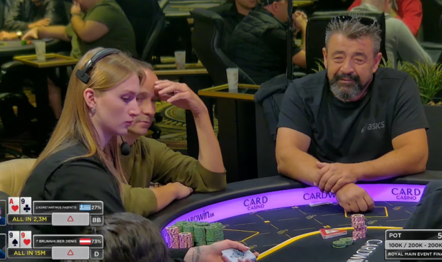 Σε blinds 100k/200k ο Dennis Brunnhuber άνοιξε για 450k από το btn, o Bundik Norbert έκανε το call στο sb και ο Πασπάτης απάντησε με all-in στο bb (2.3m) κρατώντας .
