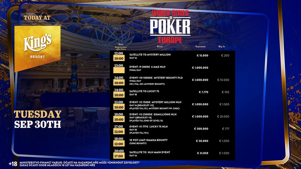 Στο event #9 (€3.000 NLH) πέρασαν από τη Day 1b oι Γιώργος Τσουλόφτας (527.000) και Ηρακλής Μανίκαρος (59.000), ενώ από το event #11 (€777 Lucky) την πρόκριση πήρε από το πρώτο flight ο Παναγιώτης Μαυριτσάκης με 90.000 chips.