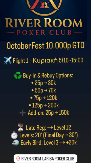 Το πρώτο από τα πέντε συνολικά flights της Day 1 του Octoberfest 10k gtd ξεκινάει απόψε στις 15:00 στο River room poker club της Λάρισας!