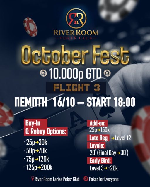 Στις 18:00 το ραντεβού των παικτών στο River room poker club της Λάρισας για το τρίτο flight του Octoberfest που συνοδεύεται από 10.000p gtd!