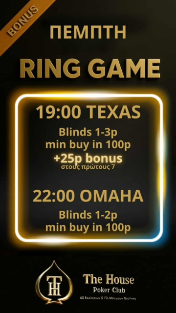 Η δράση δεν σταματάει ούτε την Πέμπτη στο “Τhe House Poker Club” με παιχνίδι από νωρίς το απόγευμα.