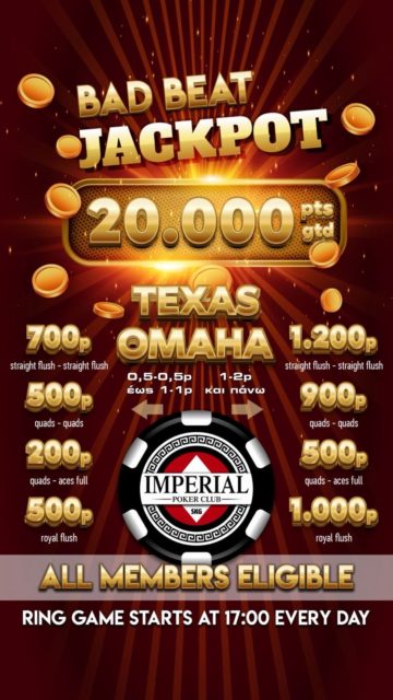 Ring games απόψε και από τις 21:00 ανοίγουν 1p/3p Texas games και 2p/2p PLO4 games με τη συνοδεία ενός γενναιόδωρου bad beat jackpot!