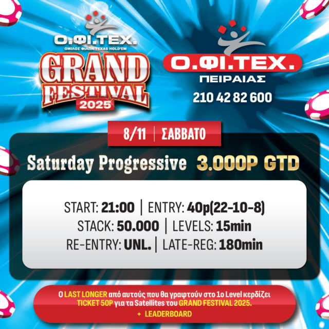 το freeroll και το Saturday Progressive (3.000p gtd) στον Πειραιά