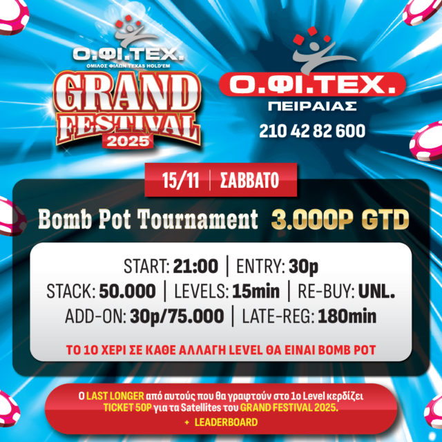 το freeroll και το Bomb Pot (3.000p gtd) στον Πειραιά