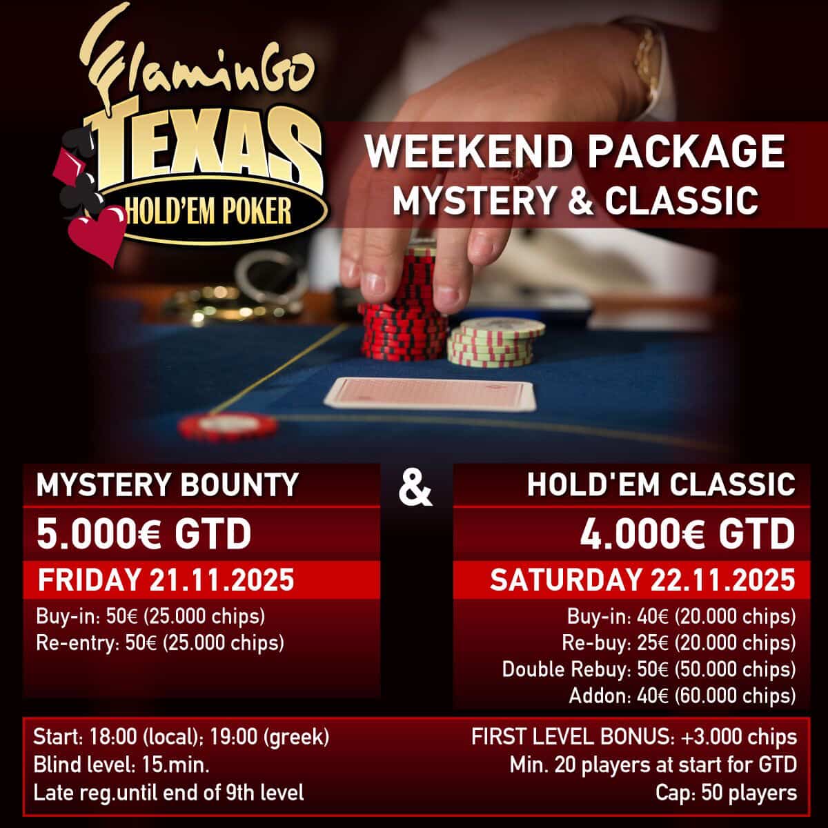 Yπενθυμίζουμε πως το €50 NLH Mystery θα ξεκινήσει την Παρασκευή στις 18:00 τοπική / 19:00 Ελλάδος με €5.000gtd και το €40 NLH το Σάββατο στις 18:00 τοπική / 19:00 Ελλάδος με €4.000gtd!