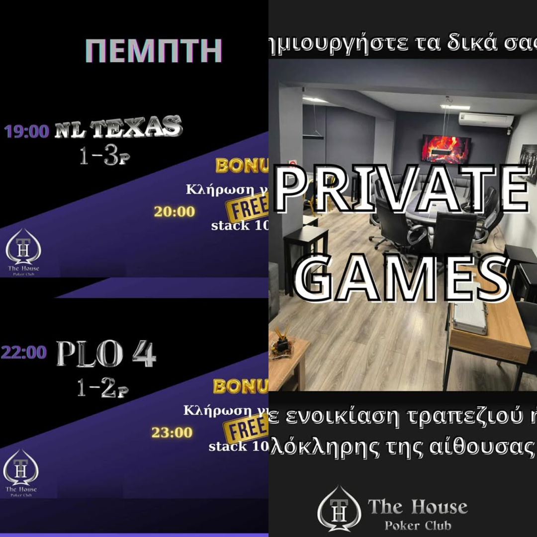 Στο Τhe Ηοuse Poker Club προσφέρεται η δυνατότητα ενοικίασης του χώρου για όσους θέλουν να διοργανώσουν τα δικά τους ring games ή τουρνουά, σε ένα περιβάλλον άνετο, προσεγμένο και πλήρως εξοπλισμένο.