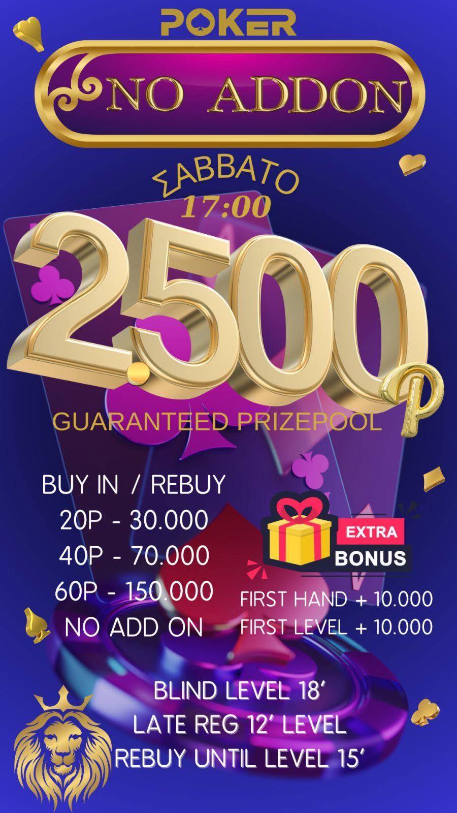 Λίγο νωρίτερα όπως κάθε Σάββατο (17:00) η έναρξη του No Addon που συνοδεύεται και πάλι από 2.500p gtd, ενώ για τους φίλους των ring games δεν θα λείπουν και τα ring games τις βραδινές ώρες!