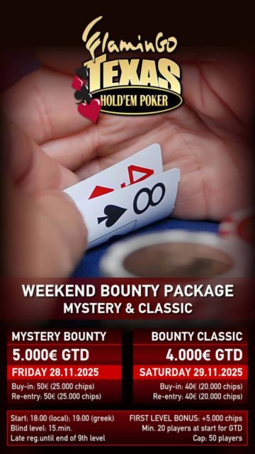 Σε… χριστουγεννιάτικο mood μπαίνει το Flamingo poker room που ανακοίνωσε δύο νέα τουρνουά για Παρασκευή και Σάββατο!