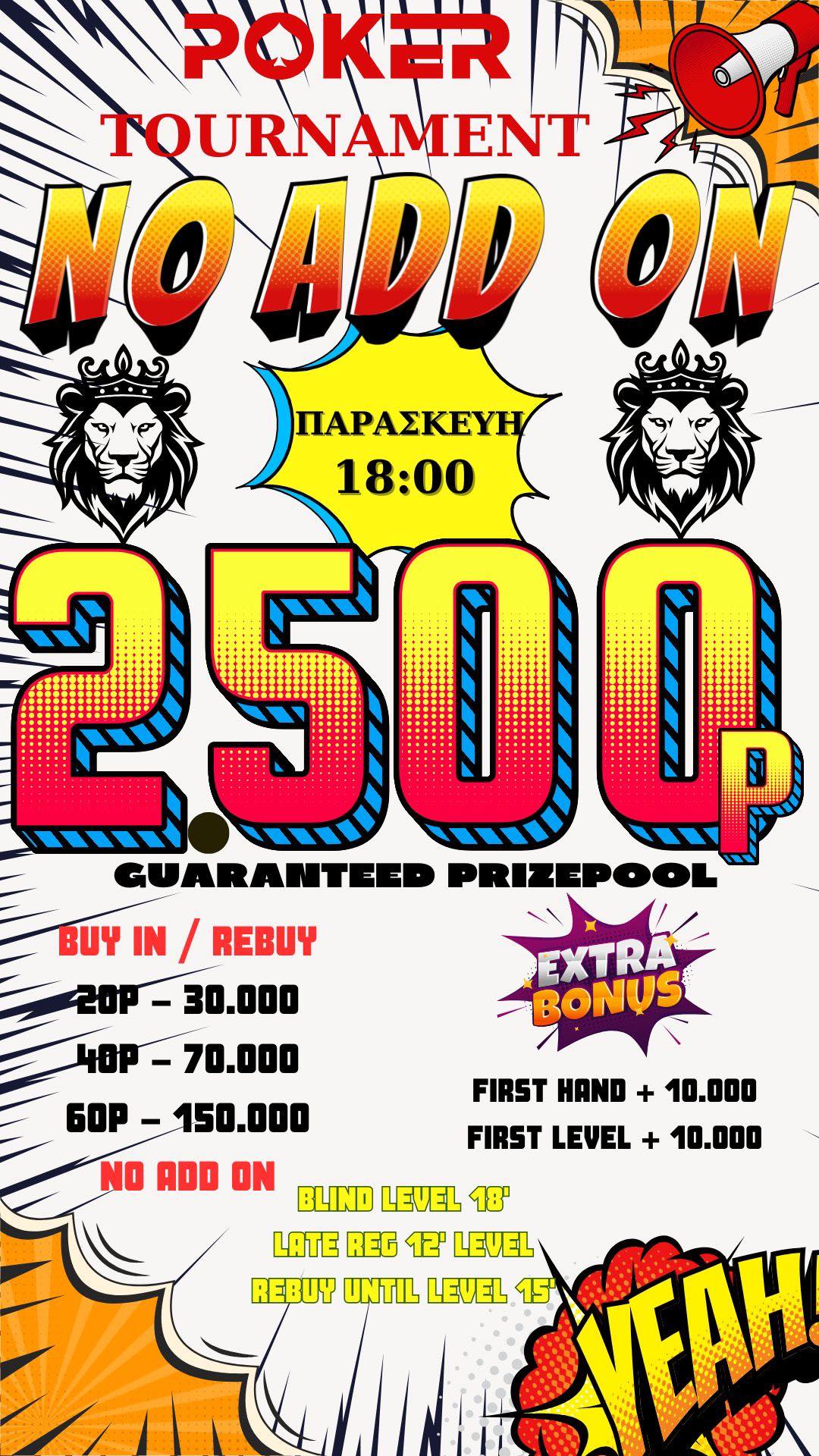 Εκτάκτως για σήμερα το πρόγραμμα έχει ένα No Addon στις 18:00 με τουλάχιστον 2.500p για τους παίκτες.