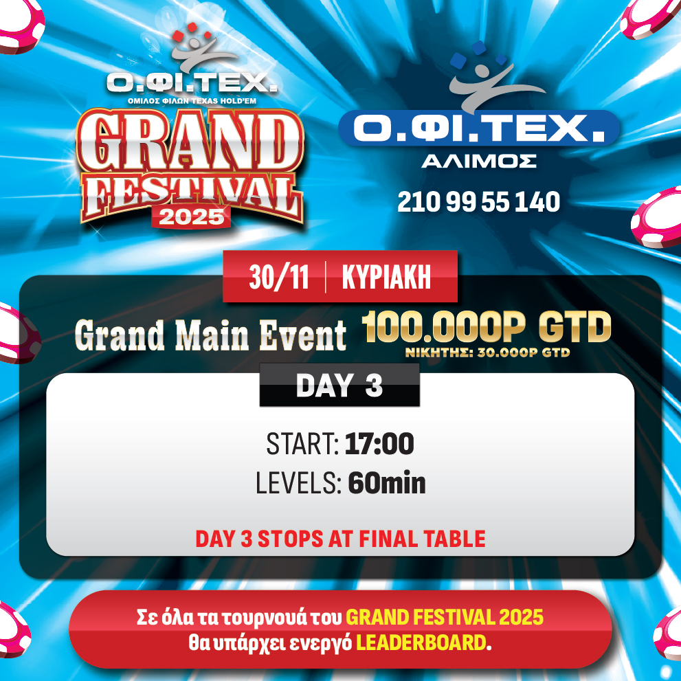 Στις 17:00 η Day 3 του Grand main event (100.000p gtd)