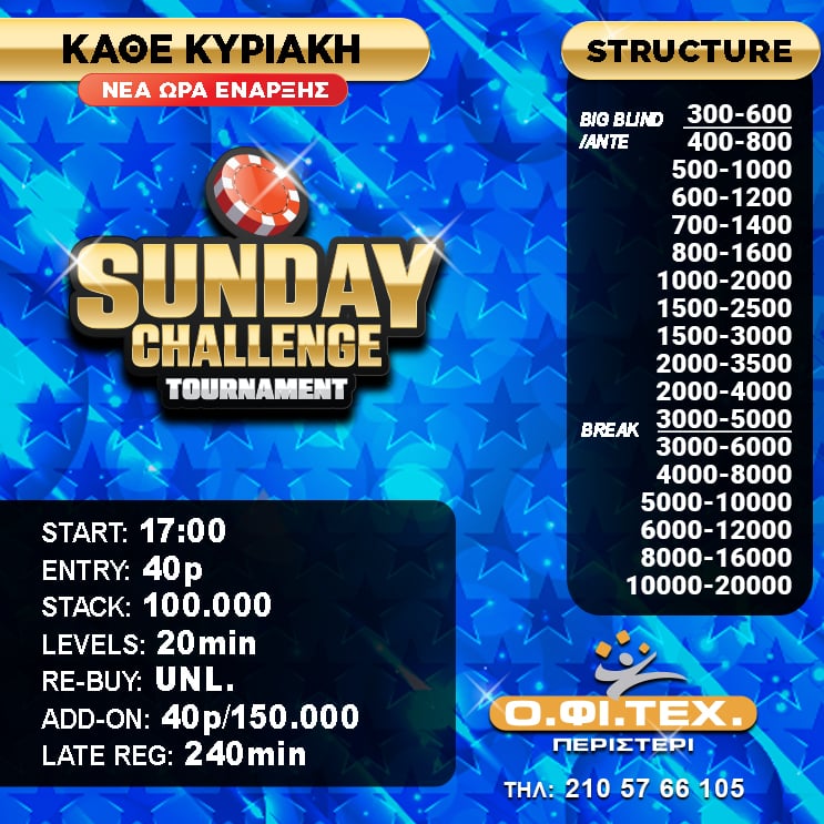 Blind levels: 15 λεπτά / 20 λεπτά μετά το break