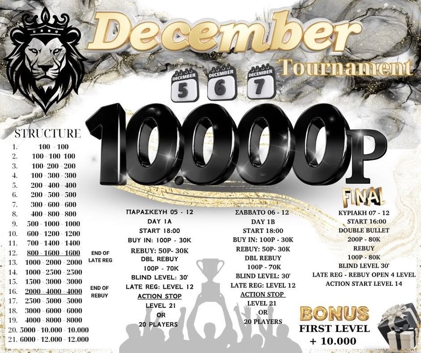 Δικαίωμα για καθυστερημένες εγγραφές στα πρώτα 12 levels και απεριόριστα rebuys (50p – 30.000 / 100p – 70.000) στα πρώτα 16 levels