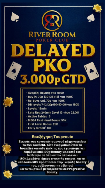 Πρεμιέρα απόψε στο River room poker club για το νέο Delayed PKO με MEGA first hand bonus (+50.000 chips) και τουλάχιστον 3.000p στους παίκτες!