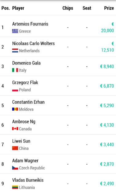 Κυριαρχώντας μέσα από ένα field 206 παικτών ήταν αυτός που επιβλήθηκε στο πολυεθνικό final table και έφτασε στην κορυφή κερδίζοντας 20.000 ευρώ για την πρωτιά και ακόμη €4.000 για τους αποκλεισμούς!