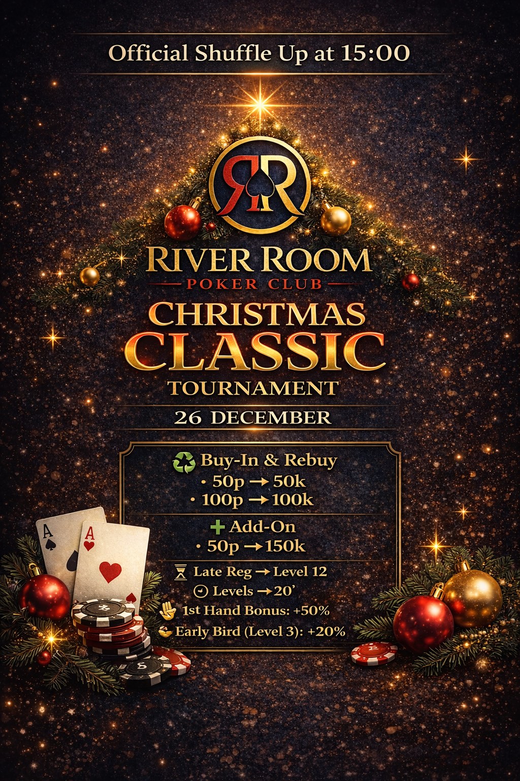 To River room poker club της Λάρισας βάζει τα γιορτινά και σας περιμένει την εορταστική περίοδο με non stop δράση καθ” όλη την χριστουγεννιάτικη περίοδο!
