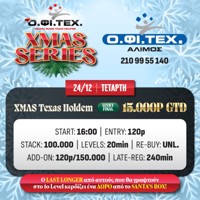 - Ένας παίκτης κερδίζει ένα BUY-IN και ένα ΔΩΡΟ από το χριστουγεννιάτικο δέντρο του ΟΦΙΤΕΧ.