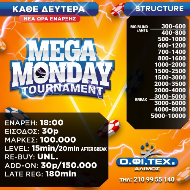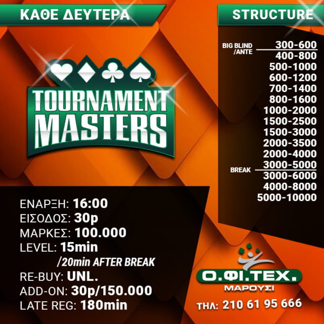 Δικαίωμα για καθυστερημένες εγγραφές και απεριόριστα rebuys (2.5p – 10.000 μάρκες) τα πρώτα 180 λεπτά