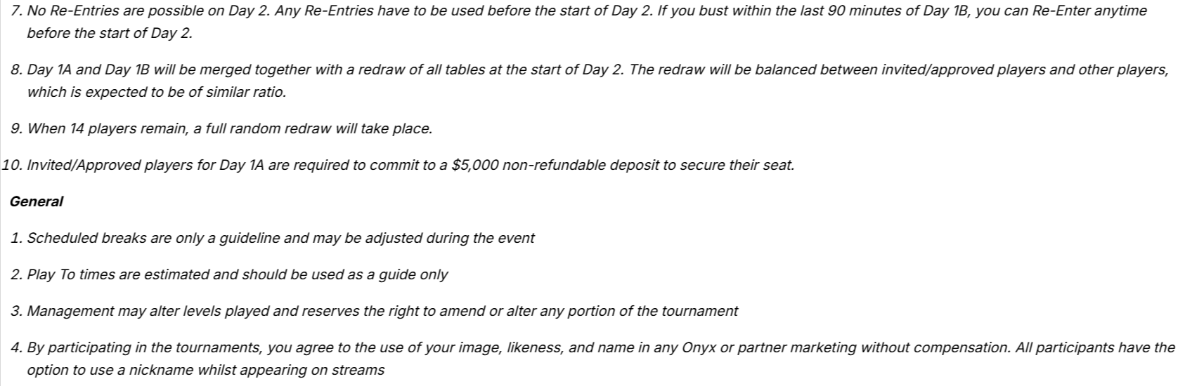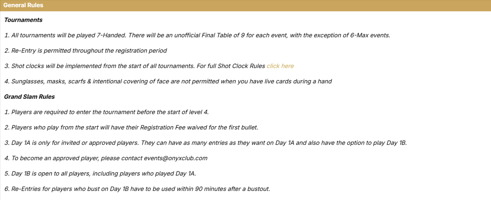 Τα χρονόμετρα αποφάσεων (shot clocks) θα χρησιμοποιούνται από την πρώτη στιγμή σε κάθε event, διατηρώντας σταθερό τον ρυθμό από τα αρχικά επίπεδα μέχρι και τα τελικά στάδια. Tα τουρνουά θα παίζονται με επτά παίκτες στο τραπέζι, με ένα ανεπίσημο τελικό τραπέζι εννέα παικτών, εκτός από τις διοργανώσεις που είναι ορισμένες ως six-max.