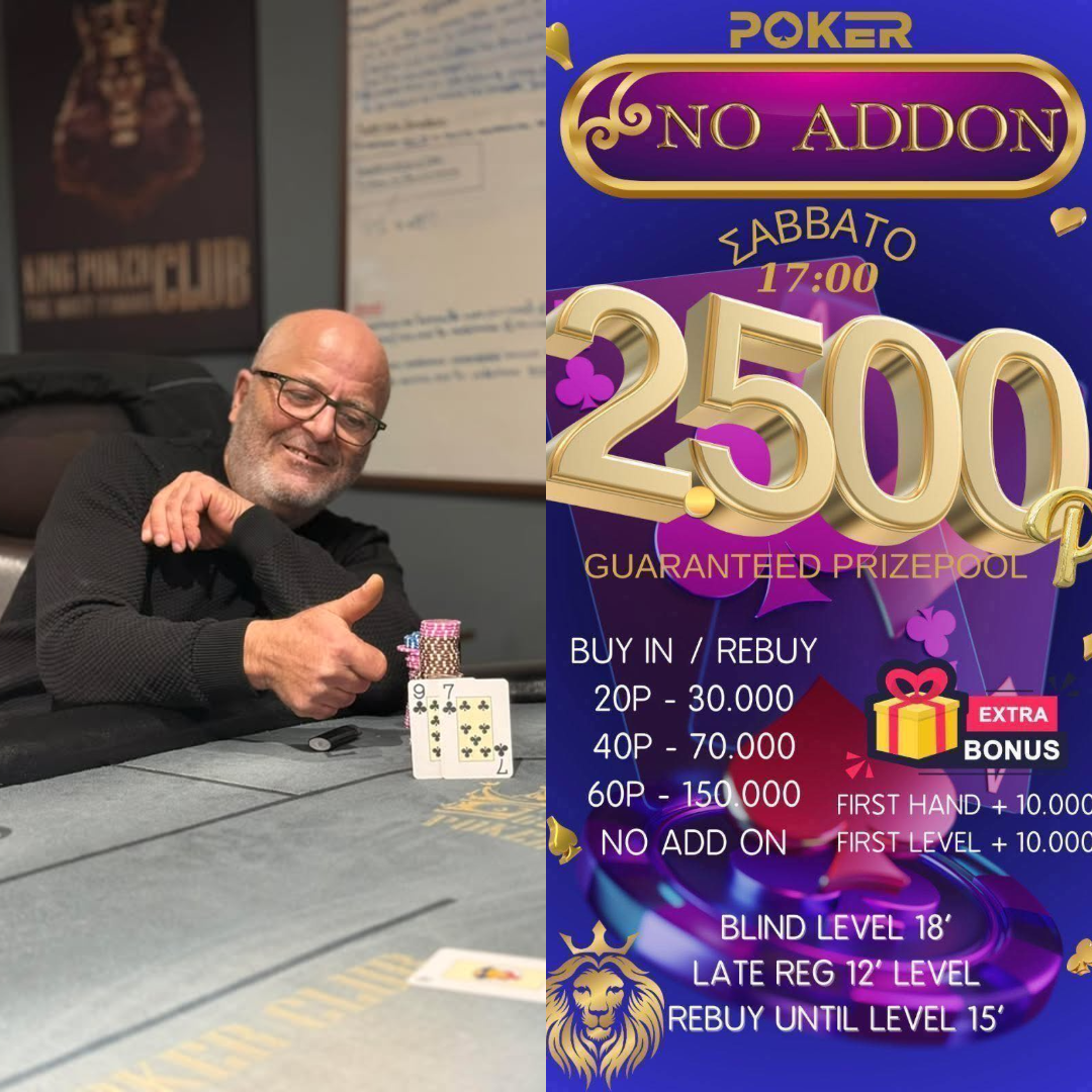 Λίγο νωρίτερα όπως κάθε Σάββατο (17:00) η έναρξη του No Addon που συνοδεύεται και πάλι από 2.500p gtd, ενώ για τους φίλους των ring games δεν θα λείπουν και τα ring games τις βραδινές ώρες!