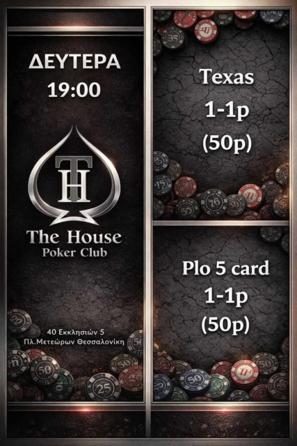 Ο Αγωνιστικός σύλλογος ‘The Ηοuse Poker Club’ εδρεύει στη 40 Εκκλησιών 5, στην πλατεία Μετεώρων.