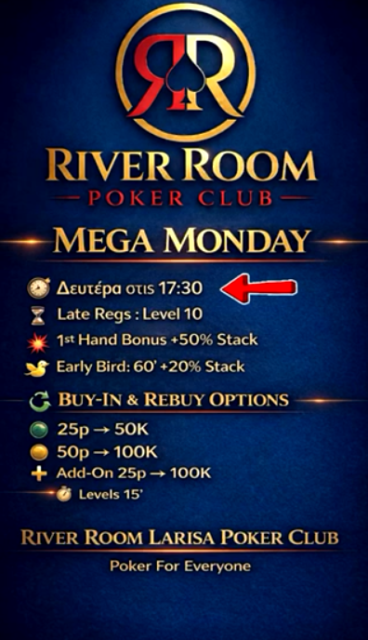 Eκτός από τα καθημερινά ring games το River room poker club της Λάρισας φιλοδοξεί να καθιερώσει τα εβδομαδιαία τουρνουά τόσο τη Δευτέρα όσο και τη Πέμπτη.