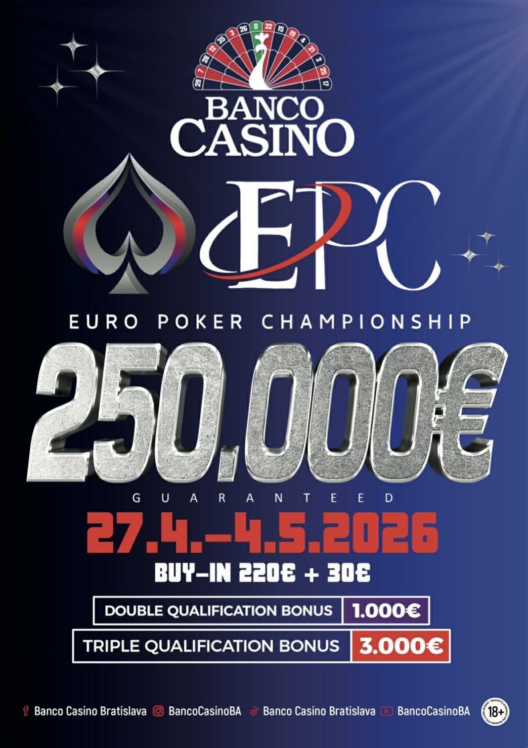 Ένας από τους πιο δημοφιλείς ποκερικούς προορισμούς στην Ευρώπη, το Banco Casino στην Μπρατισλάβα, ετοιμάζεται να φιλοξενήσει την τρίτη έκδοση του Euro Poker Championship (EPC #3) από τις 27 Απριλίου μέχρι και τις 4 Μαΐου!