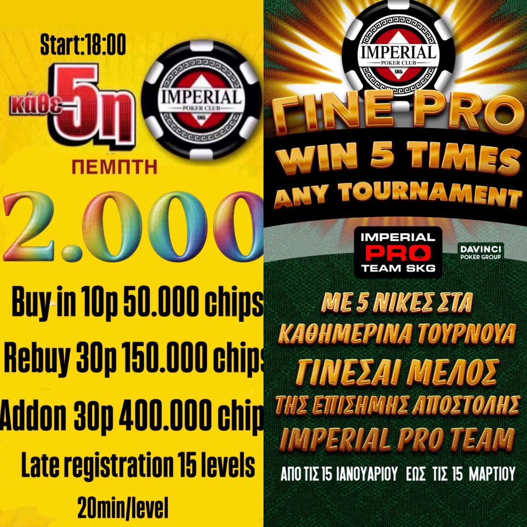 Μην ξεχνάτε πως με 5 νίκες στα καθημερινά τουρνουά (15 Ιανουαρίου – 15 Μαρτίου) γίνεστε μέλη της Imperial Team Pro και κερδίζετε πακέτο για το Apollonia BPC #4, ticket για το main event, για τα δύο bounty events και διαμονή!