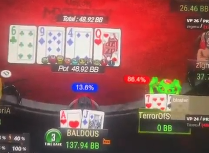 Ο παίκτης από το Ηνωμένο Βασίλειο με το ψευδώνυμο «BALDOUS» δεν κέρδισε μόνο το μεγαλύτερο bounty του ACR Venom Mystery Bounty NLHE Event, αλλά κατέγραψε και τη στιγμή σε βίντεο. Όντας all-in με δύο overcards, ο BALDOUS χρειαζόταν να «χτυπήσει» στο river για να μην αντέξουν τα επτάρια του αντιπάλου του απέναντι σε Α-J. Ένας βαλές στο river είχε πιθανότητα μόλις 13,6%, όμως τελικά εμφανίστηκε – και μαζί του ήρθε και το bounty των 500.000 δολαρίων, όπως φαίνεται και στο βίντεο.